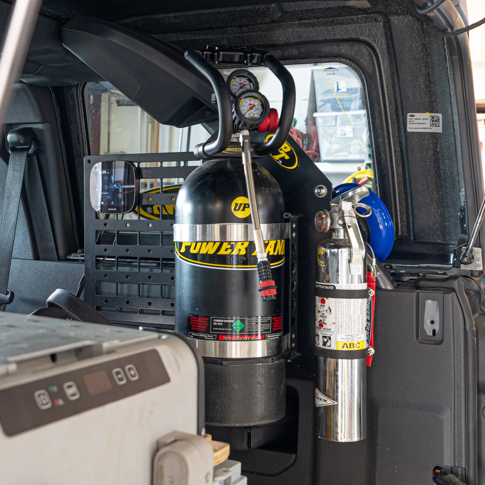 You can choose a driver or passenger mount for your Bronco Plate. It mounts using billet roll bar clamps attached to the rear roll bar, also included. This creates a solid mount for your Power Tank and other accessories like an optional Fire Extinguisher Bracket. We have even more expandability planned so make sure to follow us on Instagram or subscribe to our VIP newsletter.