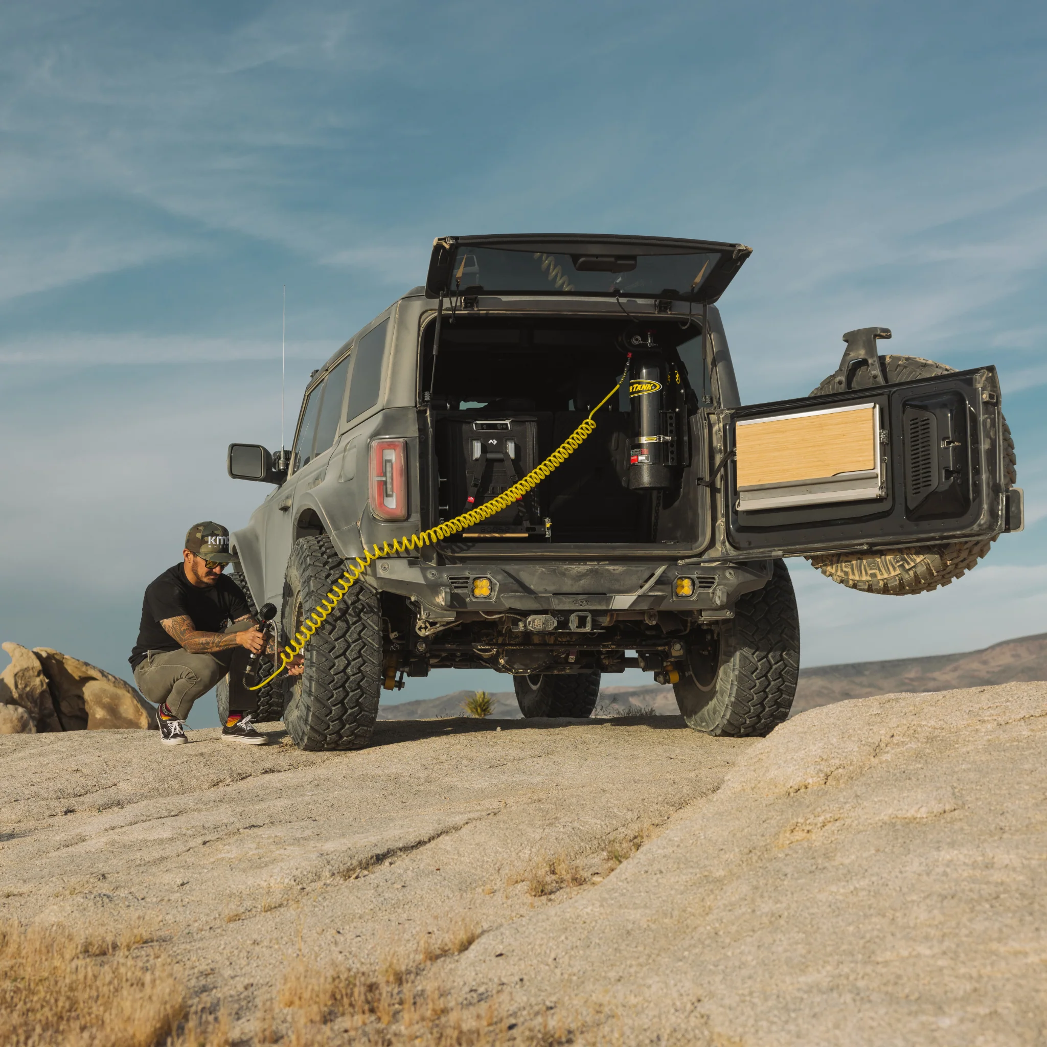 This 4 Door Bronco Edition Power Tank includes everything you need to run air tools with our advanced universal safety Super Coupler and air up tires through a dedicated HD Tire Inflator with Gauge. It also includes a Bronco Plate mount mated to a Super Bracket for an easy mounting solution, placing your Power Tank up high, maximizing rear cargo space.