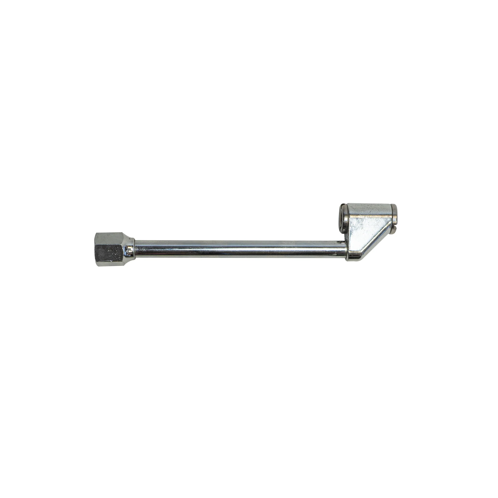 Angled back fits most dual wheels with steel wheels and some aluminum wheels with large openings. This model comes either “closed” or “open”. The closed chuck holds back air until you push it onto a stem. The open version is required when attached to a tire inflator like our Ventoso RED tire inflators.